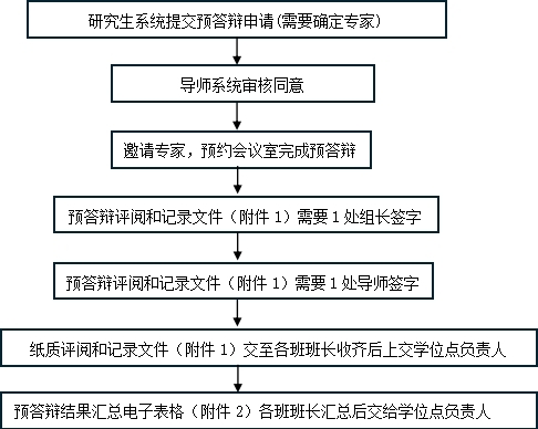 (2) 预答辩结束后补充完善预答辩评阅和记录文件(附件1),预答辩记录部分需由答辩秘书(专任教师)签字确认,送审意见由答辩组长签字,最后论文修改后送审意见由导师签字。班长收齐后交给学位点负责人审核,审核完后上交院办毛老师。